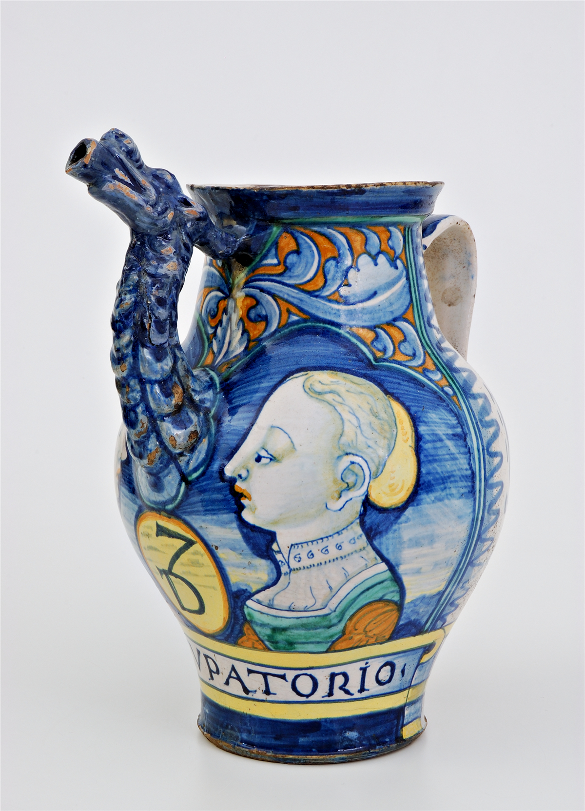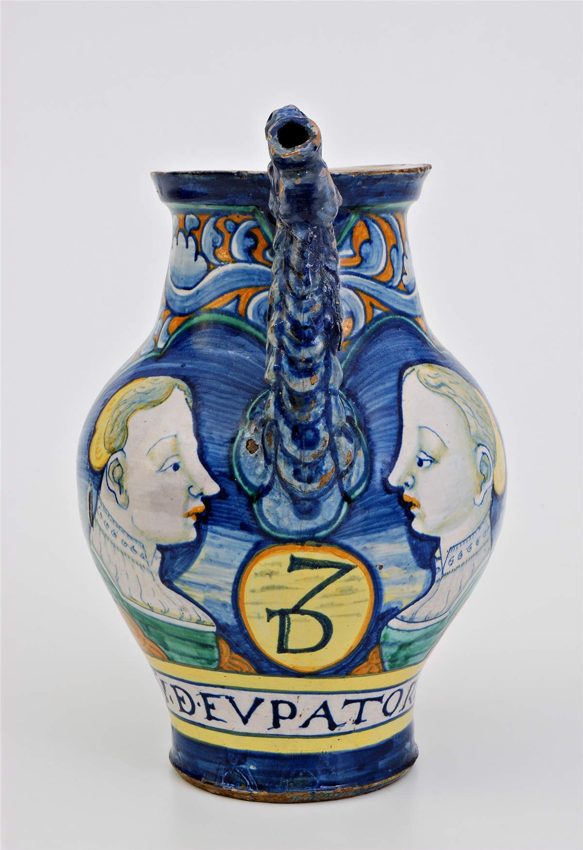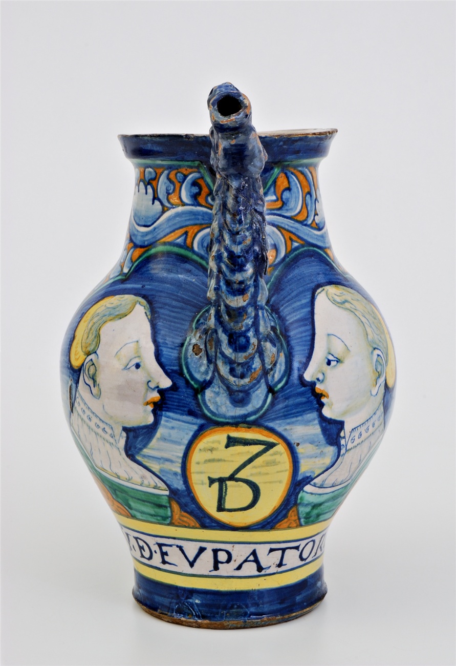 这件雅致的执壶可以视作16 世纪中期阿布鲁佐的陶瓷中心—卡斯泰利镇生产的药房器皿中的标准器,属于“奥西尼- 科隆那”套件。卡斯泰利镇著名的庞 贝工作坊一共生产了240 件标准器,可能分属不同的药房,但件件品质优良。此件作品绘有两名女子的侧面头像,并写有文字“SYO.DE.EVPATORIO”,意为“糖 浆”。执壶的壶嘴塑成龙头形状,龙的头颈覆盖着鳞片,这在药房器皿里较为罕见。